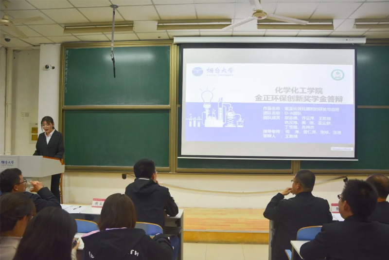 10月29日晚,煙臺大學化學化工學院年度金正環保創新獎學金答辯活動在學校綜合樓205室開展,經過學院初選,包含革新“涂”強團隊等在內的18支個人和團隊進入最終答辯環節,大賽設一等獎3名,二等獎4名,三等獎3名,共10位個人/團隊獲獎。