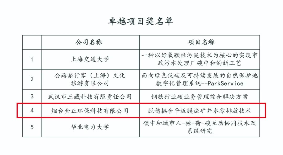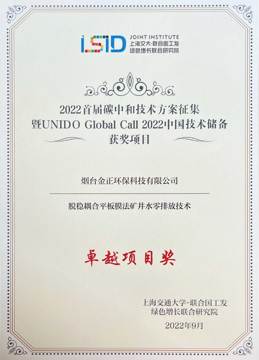 煙臺金正環(huán)保憑借環(huán)保水處理行業(yè)脫穩(wěn)耦合平板膜法礦井水零排放技術(shù)榮獲卓越項目獎,也是山東省唯一獲此獎項的單位。